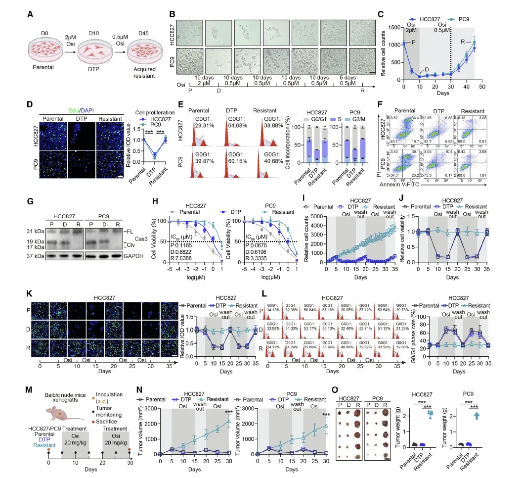 Figure 1:该图围绕奥希替尼(Osi)治疗诱导非小细胞肺癌细胞产生可逆性药物耐受持留(DTP)状态展开系统性验证,明确了 DTP 是肺癌细胞获得性耐药过程中的关键中间状态。通过构建 HCC827 和 PC9 细胞的 Osi 处理模型,经 45 天药物处理成功诱导出亲本、DTP 及获得性耐药三种细胞状态,形态学观察显示 DTP 细胞生长受显著抑制;EdU 和细胞周期实验证实 DTP 细胞呈 G0/G1 期阻滞的慢周期特征,增殖能力显著降低;凋亡实验和 Caspase-3 检测发现,相较于亲本细胞,DTP 和获得性耐药细胞在 Osi 处理下的凋亡率明显更低,IC50 实验进一步验证了三种细胞对 Osi 的敏感性依次降低。体外药物洗脱实验显示 DTP 细胞在撤药后可恢复增殖,而获得性耐药细胞则持续耐药,裸鼠皮下移植瘤模型也在体内层面证实了 DTP 状态的可逆性,即 Osi 处理下 DTP 肿瘤生长受抑,撤药后恢复增殖,而获得性耐药肿瘤不受药物影响,全面明确了 DTP 细胞的核心生物学特征及在耐药发生中的中间地位。