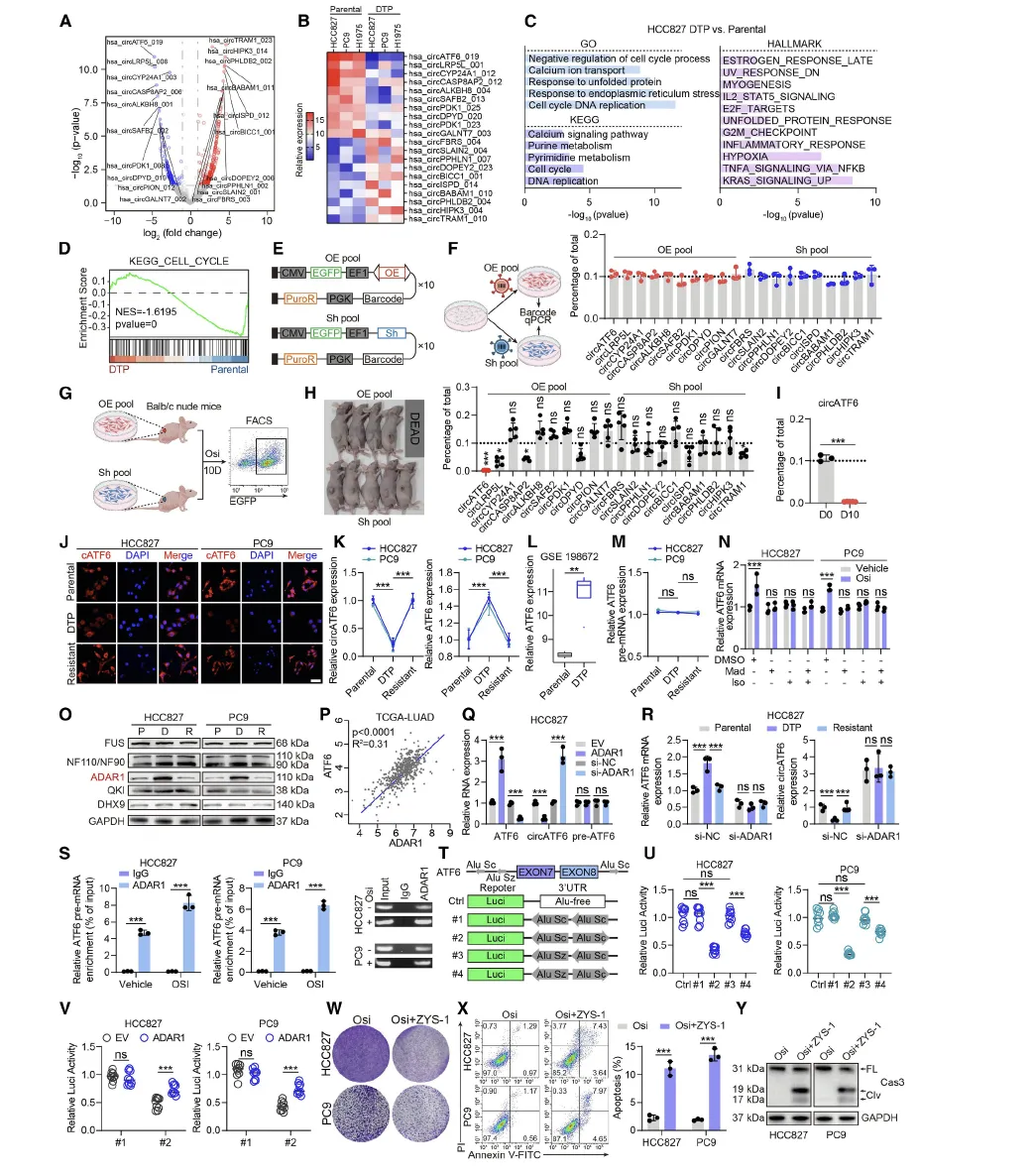 Figure 2:该图旨在鉴定 DTP 细胞中差异表达的环状 RNA 并明确 circATF6 的调控机制,证实 circATF6 在 DTP 细胞中因 ADAR1 介导的剪接调控特异性下调。全转录组测序筛选出 DTP 细胞中 216 个下调的环状 RNA,经慢病毒文库筛选发现 circATF6 与 EGFR-TKI 具有协同作用,后续验证确认 circATF6 为包含 ATF6 第 7、8 外显子的 407nt 环状 RNA,具有高稳定性且主要定位于细胞质。表达检测显示 circATF6 在 DTP 状态中特异性下调,而其亲本基因 ATF6 表达趋势相反,且该差异与药物浓度无关;通过剪接因子筛选发现 ADAR1 在 DTP 细胞中高表达,其通过结合 ATF6 前体 mRNA 的反向 Alu 元件抑制 circATF6 的环化生成,STAT3 通路激活介导了 DTP 细胞中 ADAR1 的上调。敲低 ADAR1 可恢复 circATF6 的表达,ADAR1 抑制剂 ZYS-1 联合 Osi 可显著促进 DTP 细胞凋亡,明确了 ADAR1 是调控 circATF6 在 DTP 细胞中下调的关键分子。