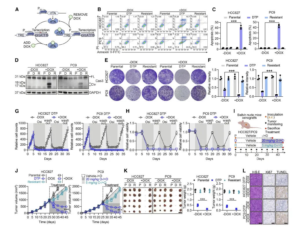 Figure 3:该图通过体内外功能实验验证 circATF6 与奥希替尼的协同抗癌作用,证实恢复 circATF6 表达可选择性诱导 DTP 细胞凋亡并增强 Osi 的疗效。利用 Tet-On 系统构建可诱导 circATF6 过表达的细胞模型,体外实验显示,多西环素诱导 circATF6 过表达后,在 Osi 处理下 DTP 细胞的凋亡率显著升高,Caspase-3 活化增强,克隆形成能力和细胞活力显著降低,而亲本和获得性耐药细胞无明显变化,且该效应与 Osi 浓度无关。药物洗脱实验证实 circATF6 过表达可抑制 DTP 细胞撤药后的增殖恢复。裸鼠皮下移植瘤模型中,诱导 circATF6 过表达联合 Osi 治疗可显著抑制 DTP 来源肿瘤的体积和重量,而对亲本和获得性耐药来源肿瘤无明显影响;免疫组化结果显示 DTP 肿瘤中 Ki-67 阳性率降低、TUNEL 阳性率升高,在体内层面证实 circATF6 可选择性增强 Osi 对 DTP 细胞的杀伤作用。