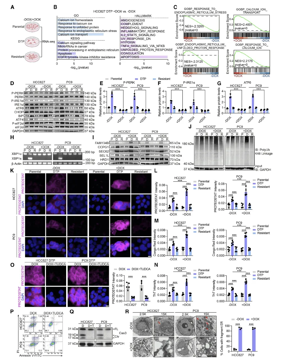 Figure 4:该图深入探究 circATF6 诱导 DTP 细胞凋亡的分子机制,证实过表达 circATF6 可破坏 DTP 细胞的内质网蛋白稳态,引发内质网结构异常。RNA 测序及 GSEA 分析显示,circATF6 过表达可显著调控 DTP 细胞中内质网应激、未折叠蛋白反应(UPR)及钙离子稳态相关通路;检测发现 DTP 细胞中 UPR 通路呈活化状态,而 circATF6 过表达可显著抑制 PERK、IRE1α、ATF6 等 UPR 关键分子的激活。进一步研究发现,circATF6 过表达后,内质网相关降解(ERAD)和内质网自噬(ER-phagy)相关分子表达虽升高,但无法逆转错误折叠蛋白的聚集,K48 多聚泛素化检测和 PROTEOSTAT 染色均证实 DTP 细胞中错误折叠蛋白大量累积。内质网化学伴侣 TUDCA 可减少错误折叠蛋白聚集并逆转 circATF6 诱导的 DTP 细胞凋亡,电子显微镜观察显示,circATF6 过表达可使 DTP 细胞的内质网由适应性扩张转变为碎裂状态,明确了蛋白稳态破坏和内质网结构异常是 circATF6 调控 DTP 细胞存活的关键环节。
