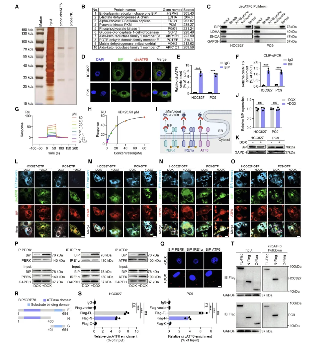 Figure 5:该图明确 circATF6 破坏蛋白稳态的直接分子靶点,证实 circATF6 通过结合内质网分子伴侣 BiP/GRP78 的 ATP 酶结构域,抑制 UPR 通路的正常激活。通过 RNA pulldown 联合质谱筛选,鉴定出 BiP 是 circATF6 的核心相互作用蛋白,RNA pulldown、RIP 和 CLIP 实验进一步验证了二者的特异性结合,表面等离子体共振(SPR)实验证实 circATF6 与 BiP 可直接结合,解离常数为 25.53 mM。亚细胞定位显示 circATF6 与 BiP 共定位于 DTP 细胞的内质网中,且 circATF6 过表达不影响 BiP 的 mRNA 和蛋白表达,而是增强了 BiP 与 PERK、IRE1α、ATF6 等 UPR 传感器的结合。通过构建 BiP 截短体突变体,发现 circATF6 特异性结合 BiP 的 N 端 ATP 酶结构域,该结合可抑制 BiP 的 ATP 酶活性,阻碍其与 UPR 传感器的解离,从而抑制 UPR 通路的适应性激活,最终导致错误折叠蛋白聚集和蛋白稳态破坏。