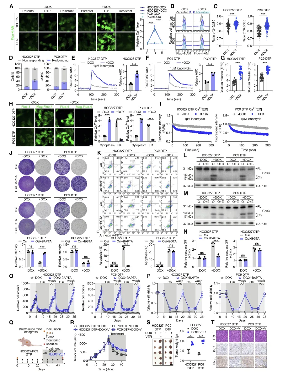 Figure 6:该图揭示 circATF6 诱导 DTP 细胞凋亡的最终效应环节,证实 circATF6 通过破坏内质网钙稳态引发细胞质钙超载,进而介导 DTP 细胞凋亡。钙离子探针检测显示,circATF6 过表达可显著升高 DTP 细胞的细胞质钙离子浓度,同时降低内质网钙离子水平,离子霉素刺激实验证实 circATF6 过表达可增强 DTP 细胞的钙离子释放通量,G-CEPIA1er 探针进一步在活细胞水平验证了内质网钙离子的大量释放。使用细胞膜通透性钙螯合剂 BAPTA-AM 可显著抑制 circATF6 诱导的 DTP 细胞凋亡,而细胞膜非通透性的 EGTA 则无此效应,证实细胞质钙超载是 circATF6 诱导凋亡的关键。体外实验显示 BAPTA-AM 可恢复 circATF6 过表达的 DTP 细胞的增殖能力,裸鼠移植瘤模型中,钙离子通道阻滞剂维拉帕米可逆转 circATF6 联合 Osi 对 DTP 肿瘤的抑制作用,恢复肿瘤增殖并降低凋亡率,明确了钙超载是 circATF6 介导 DTP 细胞凋亡的核心下游机制。
