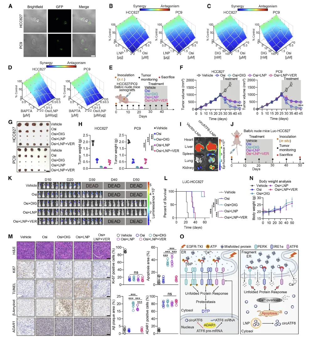 成功构建可逆的 NSCLC DTP 细胞模型,发现 DTP 细胞呈 G0/G1 期阻滞、对奥希替尼敏感性降低且 UPR 通路激活;全转录组测序发现 circATF6 在 DTP 细胞中由 ADAR1 调控而下调,过表达 circATF6 可选择性诱导 DTP 细胞凋亡并增强奥希替尼的抗癌效果。机制研究表明,circATF6 定位于细胞质并与 BiP 的 ATP 酶结构域结合,稳定 BiP 与 UPR 传感器的结合,抑制 UPR 通路激活,导致错误折叠蛋白聚集、蛋白稳态破坏,引发内质网碎裂;内质网钙库释放至细胞质造成钙超载,最终诱导 DTP 细胞凋亡。脂质纳米粒封装的 circATF6 递送系统可高效转染肿瘤细胞,在体内外模型中与 EGFR-TKI 协同抑制肿瘤生长,且对小鼠主要脏器无明显毒性,ADAR1 抑制剂可增强该协同效果。
