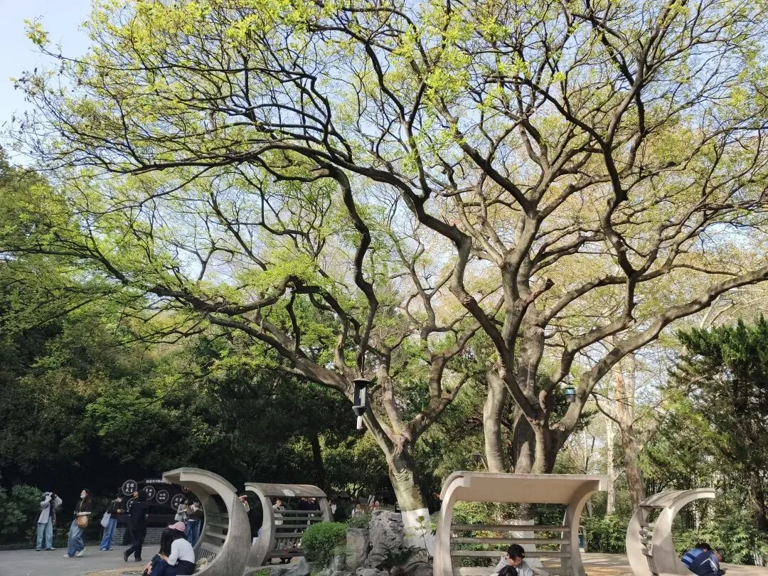 吃饱喝足,我们沿着林荫道一路向西,走进了菊花台公园。刚进园,就被一棵巨大的古树震撼,虬劲的枝干遮天蔽日,新抽的嫩芽在阳光下闪着光,像一位沉默的老者,守护着这片土地。