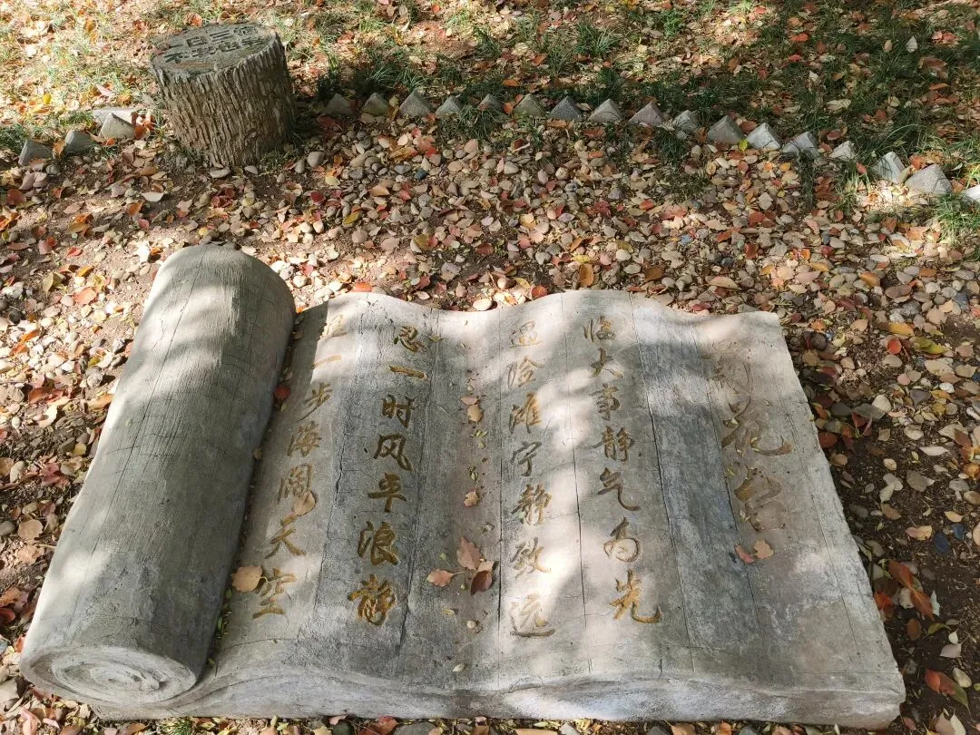 沿着石阶往上走,路边的石书雕塑静静伫立。