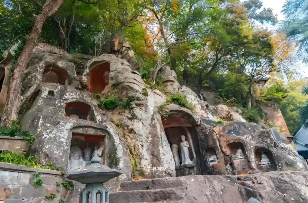 深秋时节,枫染千佛岩。南朝石刻与漫山红枫构成绝妙画卷,登上始皇临江处,可见长江如练绕城而过。