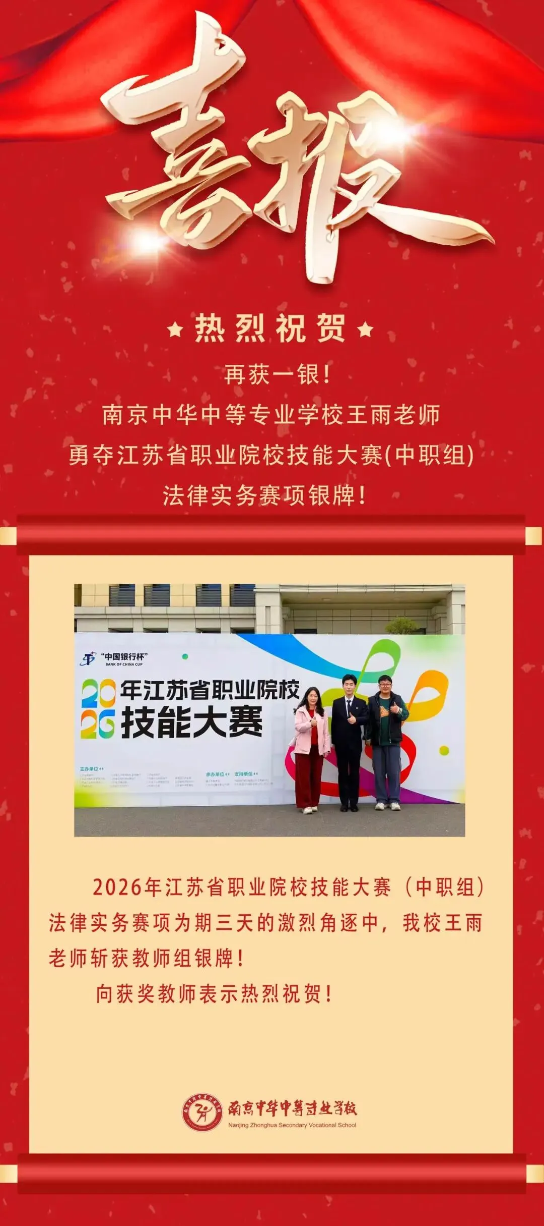 >再获一银!南京中华中等专业学校王雨老师勇夺江苏省职业院校技能大赛(中职组)法律实务赛项银牌!