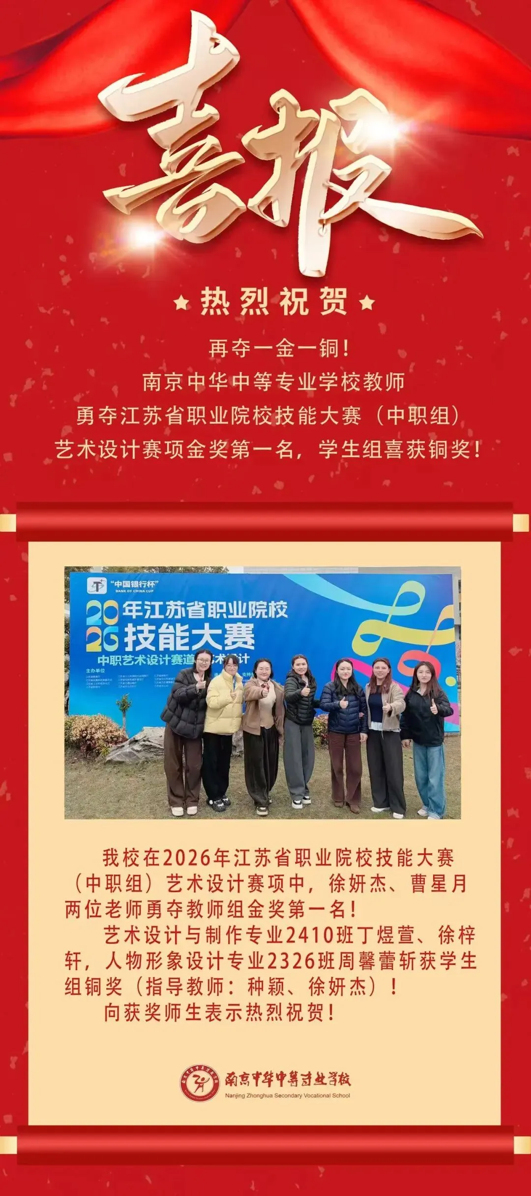 再夺一金一铜!南京中华中等专业学校教师勇夺江苏省职业院校技能大赛(中职组)艺术设计赛项金牌第一名,学生组喜获铜奖!
