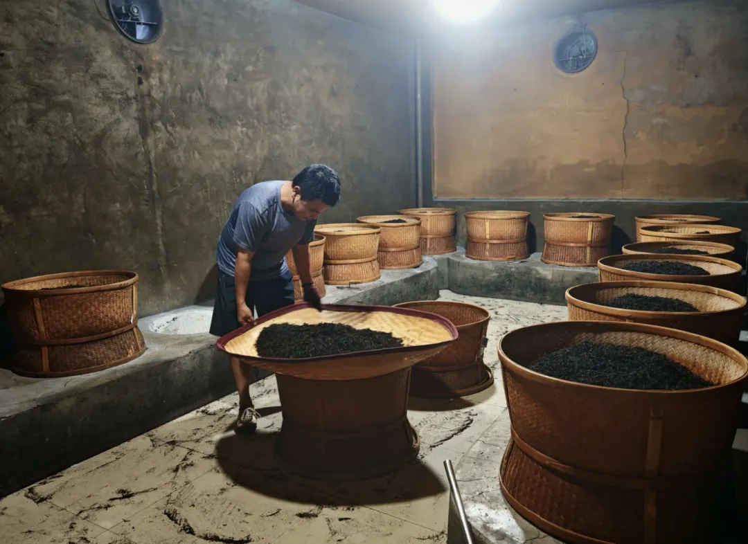 他拿起一簸正在焙的毛茶,让我摸温度。隔着棉布手套,仍能感受到那种均匀的热力。