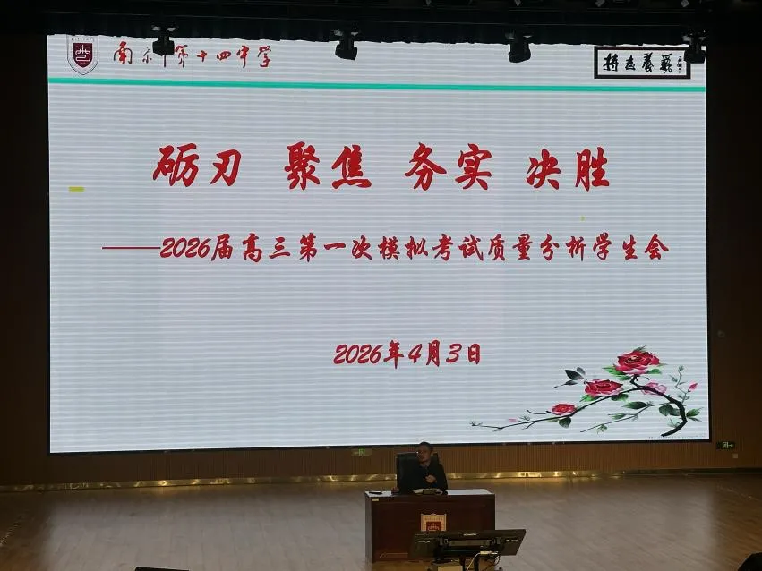 为全面总结2026届高三第一次模拟考试情况,帮助学生提振冲刺士气、明晰备考方向,2026年4月3日,南京市第十四中学在报告厅召开2026届高三第一次模拟考试分析学生大会。大会由分管高三年级的章忠春副校长主持,全体高三学子齐聚一堂,复盘考试、汲取力量、立下誓言,以昂扬姿态奔赴高考新征程。