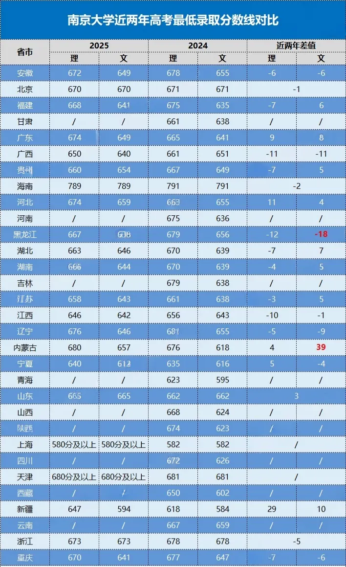 因为南京大学是高考出分前校测模式,所以没有入围分数线。我们为大家汇总整理了南京大学近两年各省市高考最低录取分数线对比,供各位考生家长参考。强基计划一般相对统招有5~35分降分优惠,推荐各位符合条件考生积极报考,争取降分上名校机会。