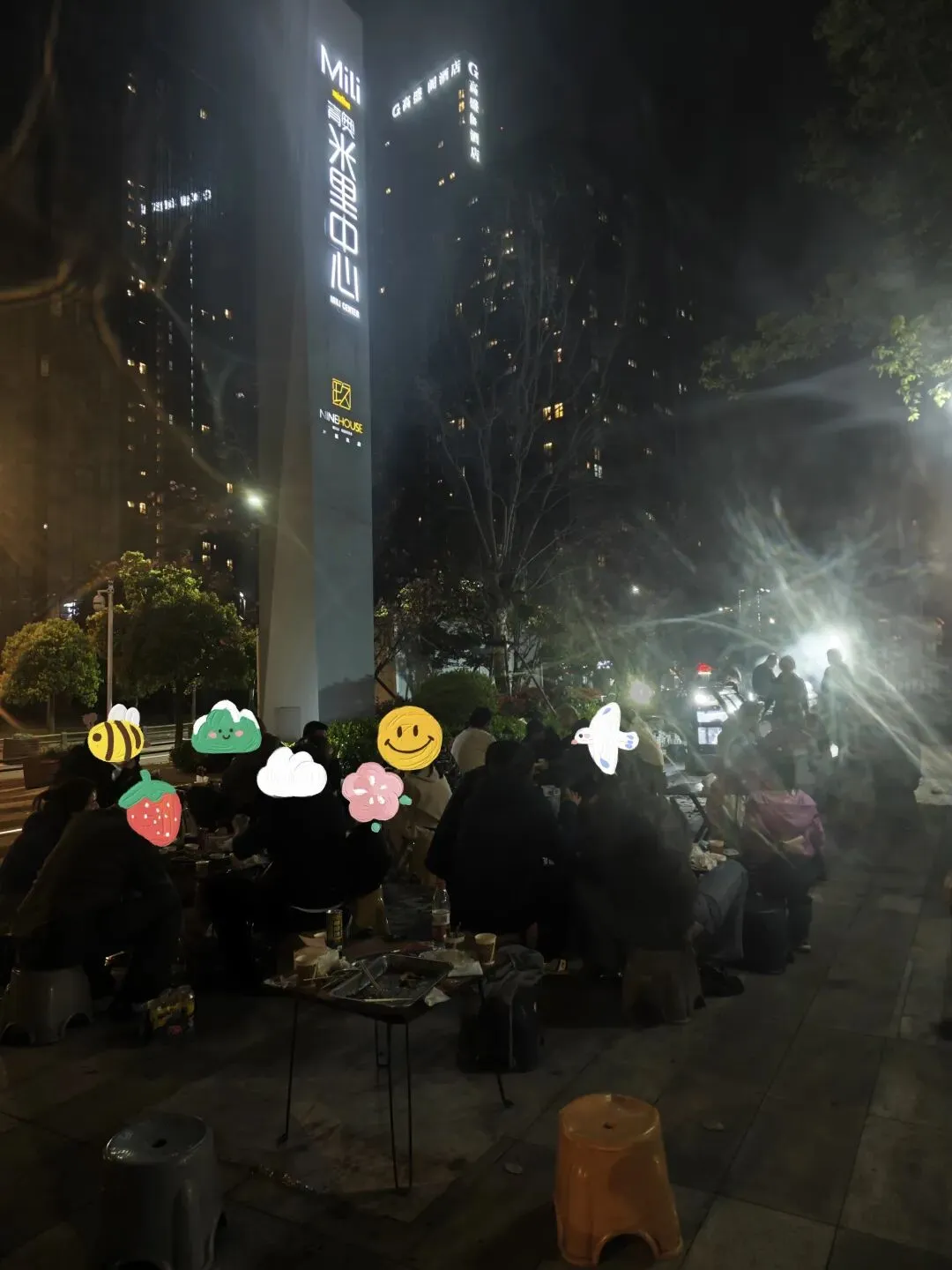 来了户外坐着用小板凳小桌子吃。