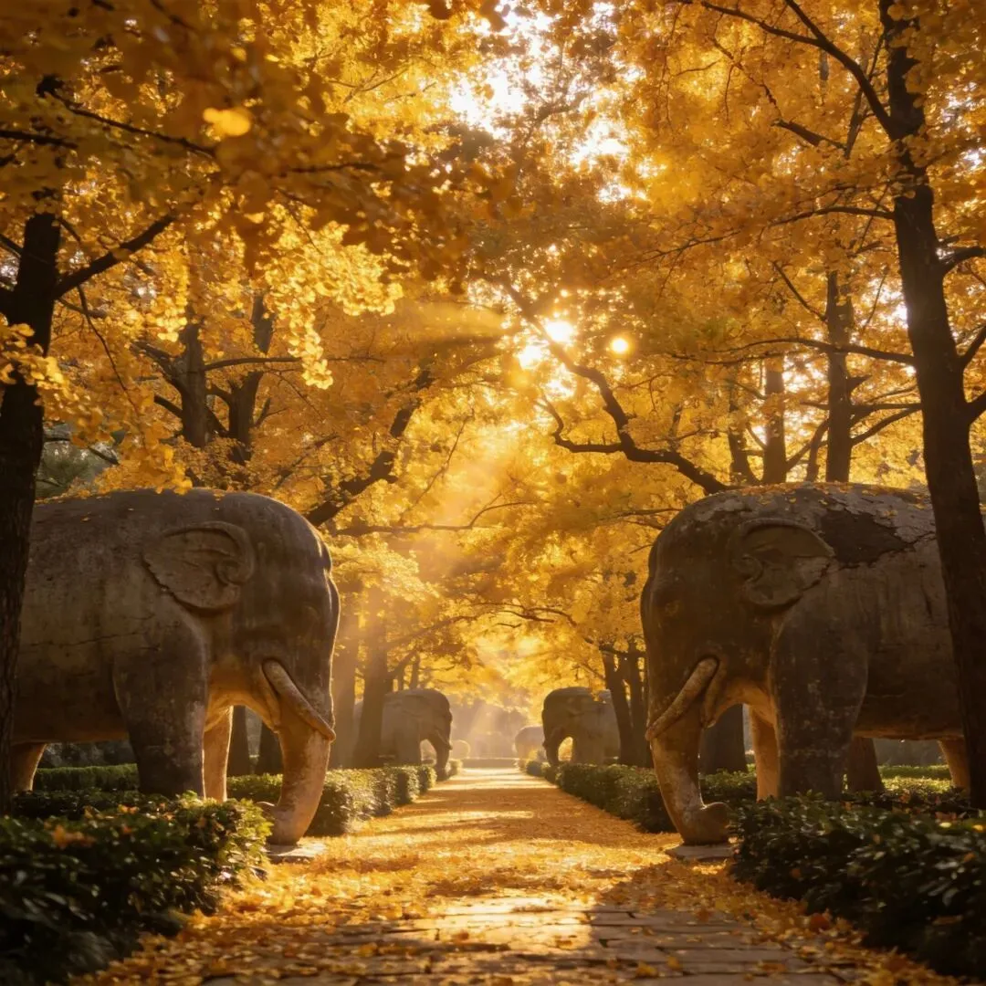 2️⃣ 明孝陵石象路:被称为"南京最美600米",神道两旁石兽守护,秋日银杏金黄,春夏绿意盎然,一年四季不同韵味~