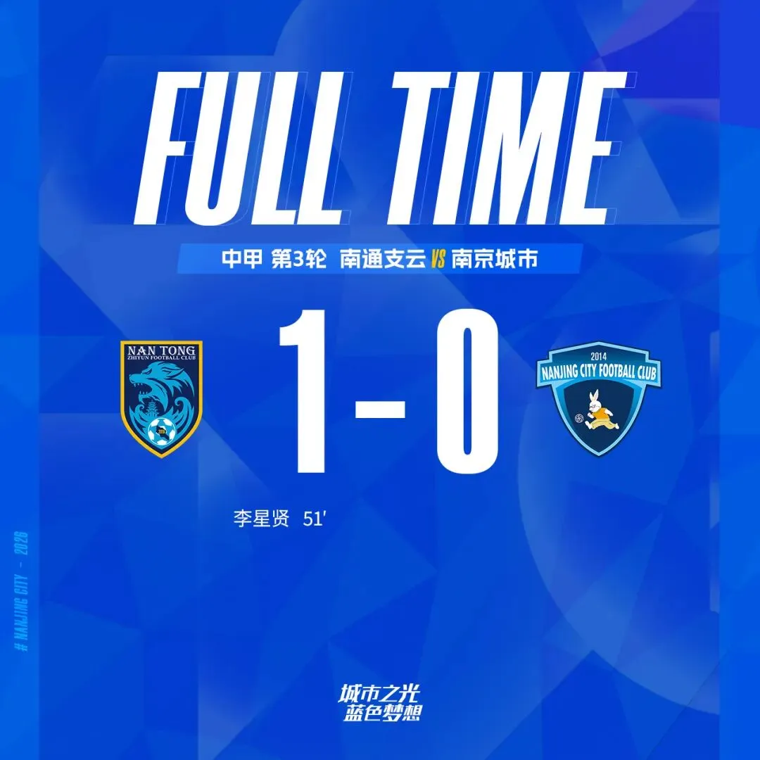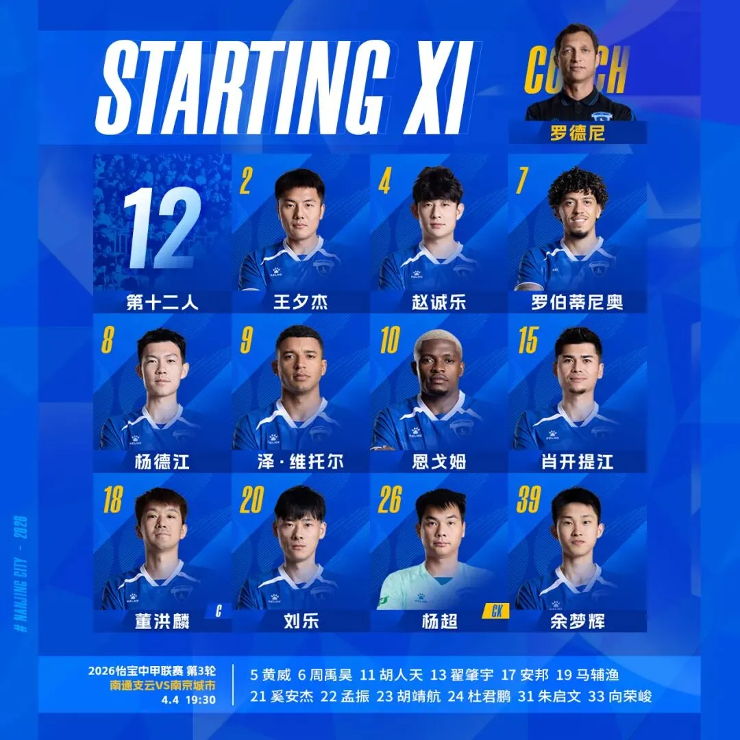 4月4日,2026怡宝中甲联赛第3轮比赛,南京城市客场挑战南通支云。上半场,双方虽互有攻防却均未能改变场上比分;下半场,南通支云通过补射进球取得领先。最终,南京城市客场0:1憾负南通支云。第10分钟,肖开提江利用对手后防失误获得球权,随即尝试远射,遗憾射门偏出左侧立柱;第28分钟,禁区内一片混战,皮球落到余梦辉身前,后者趁机射门,可惜稍稍偏出;第33分钟,董洪麟后场长传,维托尔在双人包夹的情况下不停球直接打门,皮球擦左侧立柱滑出;第36分钟,杨德江转身横敲恩戈姆,后者晃开角度射门,可惜皮球高出横梁;第38分钟,罗伯蒂尼奥将球转移至右路,余梦辉快速向前推进,在弧顶前尝试一脚远射,可惜射门角度过正,球被对方门将没收;第41分钟,刘乐左路斜传,余梦辉插上射门遗憾打偏。下半场易边再战。第51分钟,南通支云补射进球,南通支云1:0南京城市;第65分钟,余梦辉前场任意球直接射门,球被对方门将双拳击出;第71分钟,肖开提江下底传中,黄威在弧顶处打门,球被对方门将抱住;第78分钟,肖开提江右路传中,维托尔禁区内头球顶偏;赛后新闻发布会上,主教练罗德尼表示:“在比赛前,我们就知道今天的这场比赛肯定是困难的。南通是想要冲超的队伍,在之前的比赛里也是保持着不败,同省德比会是非常的困难。上半场的比赛其实保持了一个比较均衡的状态,两边都没有创造出太多的机会。下半场的比赛,南通支云抓住了一次非常好的机会完成进球。我们当时的反应有些太慢了,可以稍微再快速一点作出回应,创造出更多的机会。带着这样的结果回到南京还是比较遗憾的,我们回去会好好总结、认真工作,争取在后续的比赛中有个更好的结果。最后表扬一下队员们在比赛中的全情投入和拼搏精神,我觉得如果我们想要在联赛中有更好的成绩,那就要把拼搏精神保持下去,继续努力踏实工作。”后卫:王夕杰、赵诚乐(67’杜君鹏)、肖开提江、刘乐