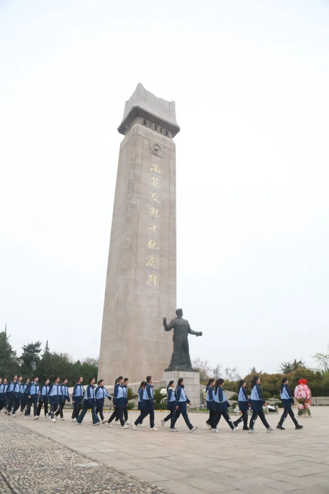 在雨花台烈士纪念碑前,祭扫仪式庄重举行。全体师生齐声高唱中华人民共和国国歌,嘹亮的国歌在陵园上空久久回荡,饱含着对祖国的无限热爱;在庄严肃穆的气氛中,仪仗礼兵手捧花篮,迈着沉稳的步伐走向烈士群雕像,将花篮轻轻摆放在基座前,全体师生向烈士纪念碑三鞠躬,表达对革命先烈深切的缅怀与崇高的敬意;两名学生代表缓步上前整理花圈缎带,寄托对英烈的无限追思。随后,全体师生怀着崇敬之心,绕行革命烈士纪念碑一周,缓步瞻仰丰碑,追忆革命先辈的峥嵘岁月与崇高精神。
