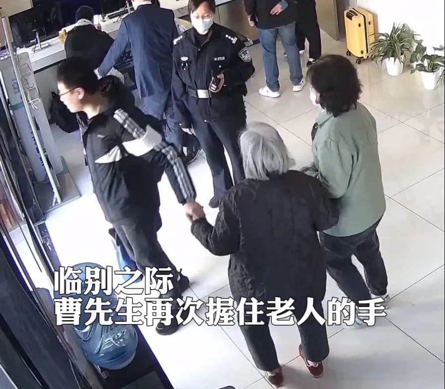 临别之际,小曹再次握住老人的手,两人依依不舍道别。