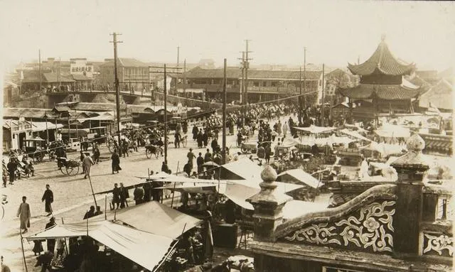 这张热闹得很,图中身影密密麻麻,摊棚一顶挨一顶,前头建筑屋檐卷着花翎边,右手一拐就是个大庙,不少人撑伞或身着长衫,街上车夫来回穿梭,脚步不是很急,一看就是重要路口,摊子上鸡毛掸子、瓜果零食、家常小用全带着,后面电线杆矗在灰蒙天色里,说白了,这样的南京,热闹全靠一口叫卖和走街串巷的脚力,不论是赶集的老太太,还是找点零活的小伙计,这一圈总归要转一遭,早些年家里老人就说,夫子庙那一带永远不缺人气,杂乱,其实才是市井的呼吸。