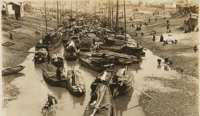老南京的下关码头,图里全是木船和忙着卸货挑水的人,水面只有船,岸边稀稀拉拉有人蹲着洗东西,有的光脚下了水,岸上人影点缀着,都是为了生活没得歇的样子,那会儿没有机器,全靠双手,货船到一次,码头上一下子就热闹了,汗水和河水夹在一起,生活气息重得都能闻出来。