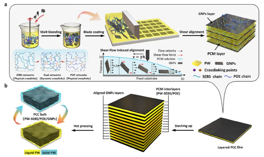 图1 相变复合材料(PCC)设计与组装的示意图说明:a) 采用熔融共混技术将石墨纳米片均匀分散在相变材料基底(PW-SEBS/POE)中,并通过刮涂工艺制备出具有高度取向层状结构的PCC薄膜。b) 将薄层PCC薄膜堆叠后热压,形成致密的PCC块体