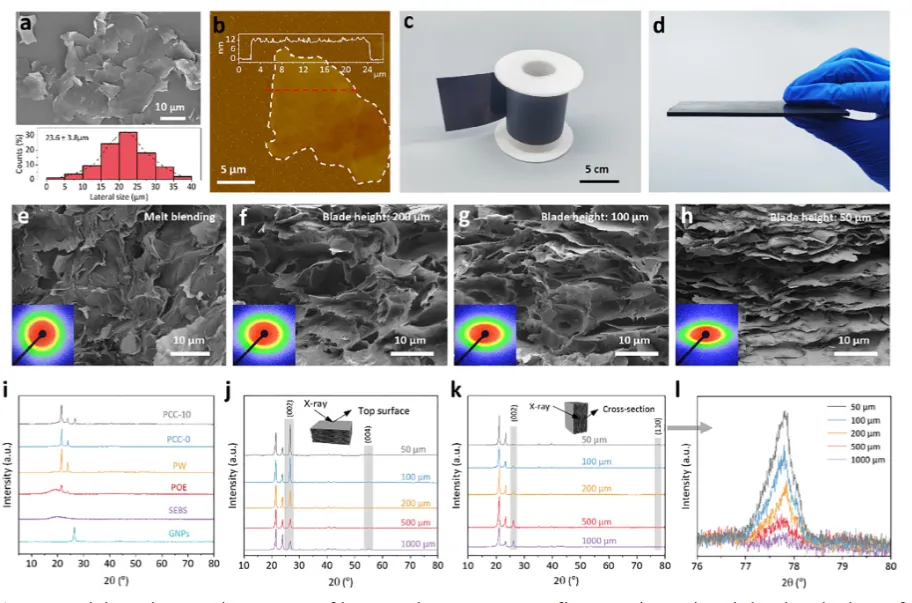 图2 石墨纳米片(GNPs)与相变复合材料(PCC)的形貌与结构表征。a) 大尺寸GNPs的SEM图像,底部为其横向尺寸分布图。b) 典型大尺寸GNPs的AFM图像。c) 刮涂法制备的PCC薄膜样品数码照片。d) PCC块体样品数码照片。e) 熔融共混法制备PCC的截面SEM图像,插图为对应的二维小角X射线散射图谱。f–h) 刮涂高度分别为200、100和50 μm时制备的PCC截面SEM图像,插图为对应的二维小角X射线散射图谱。i) PW、SEBS、POE、GNPs、PCC-0及刮涂制备的PCC-10样品的XRD谱图。j–l) 不同刮涂高度PCC样品在顶面与截面接受X射线照射时的XRD谱图结果。