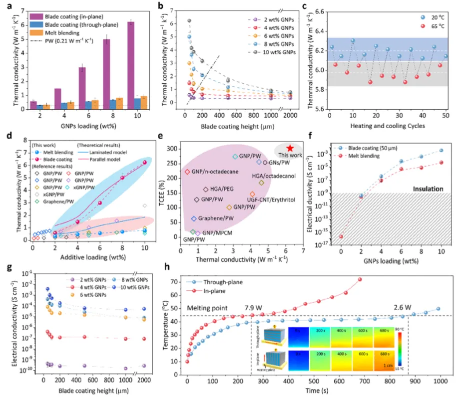 图3 相变复合材料的热导率与电导率特性。a) 不同石墨纳米片含量PCC的各向异性热导率。b) 不同石墨纳米片含量PCC的热导率随刮涂高度的变化关系。c) 循环加热-冷却测试中热导率的变化趋势。d) 本研究PCC与已报道石墨纳米片基PCC及理论计算结果的对比。[41] e) 本研究与文献报道PCC在热导率和导热增强效率方面的对比。f) 不同石墨纳米片含量PCC的电导率。g) 不同石墨纳米片含量PCC的电导率随刮涂高度的变化关系。h) 协调与非协调传热条件下PCC块体(15×15×15 mm)的温度分布曲线。插图为加热过程示意图及0-680秒内PCC对应的红外热成像图。加热板温度恒定为90°C。
