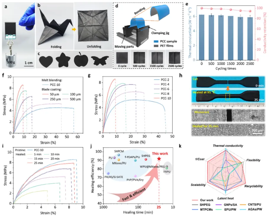 图5 相变复合材料的机械性能与自修复性能。a) PCC-10薄膜的机械强度。b) PCC-10薄膜的折纸式可折叠性与c) 易成型特性。d) 循环弯曲测试示意图(样品夹于聚对苯二甲酸乙二醇酯薄膜间)。e) PCC-10薄膜面内热导率随弯曲循环次数的变化。f) 不同刮涂高度PCC-10的应力-应变曲线。g) 刮涂高度50 μm条件下不同石墨纳米片含量PCC薄膜的应力-应变曲线。h) PCC-10在95°C自修复25分钟前后的光学与SEM图像。i) PCC-10在不同修复时长下的应力-应变曲线。j) 不同修复时长PCC的自修复效率对比。k) 雷达图综合对比本研究PCC与文献报道PCC在热导率、柔韧性、可回收性、规模化潜力和成本方面的性能(各指标已按最大值归一化)。