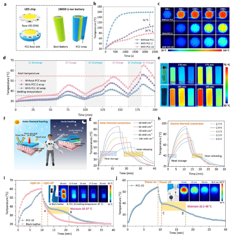 图6 热管理性能表征。a) 装配/未装配PCC的LED芯片与商用18650锂离子电池单体结构示意图。b) 配备/未配备PCC散热片的LED芯片表面温度变化曲线,c) 为对应的红外热成像图。d) 包覆/未包覆PCC的电池在连续充放电过程中的表面温度变化,e) 为对应的红外热成像图。f) 基于PCC的太阳能-热驱动与电-热驱动可穿戴热管理示意图。g) 不同模拟太阳辐照强度下PCC-10的温度变化曲线。h) 不同驱动电压下PCC-10的温度变化曲线。i) 100 W m⁻²模拟太阳辐照下人体模型表面黑色皮革与PCC-10薄膜的温度变化对比,插图为二者的数码照片与红外热成像图。j) 3.5 V电压驱动下人体模型表面PCC-10薄膜的温度变化曲线,插图为附着于人体模型的PCC-10薄膜数码照片与红外热成像图。