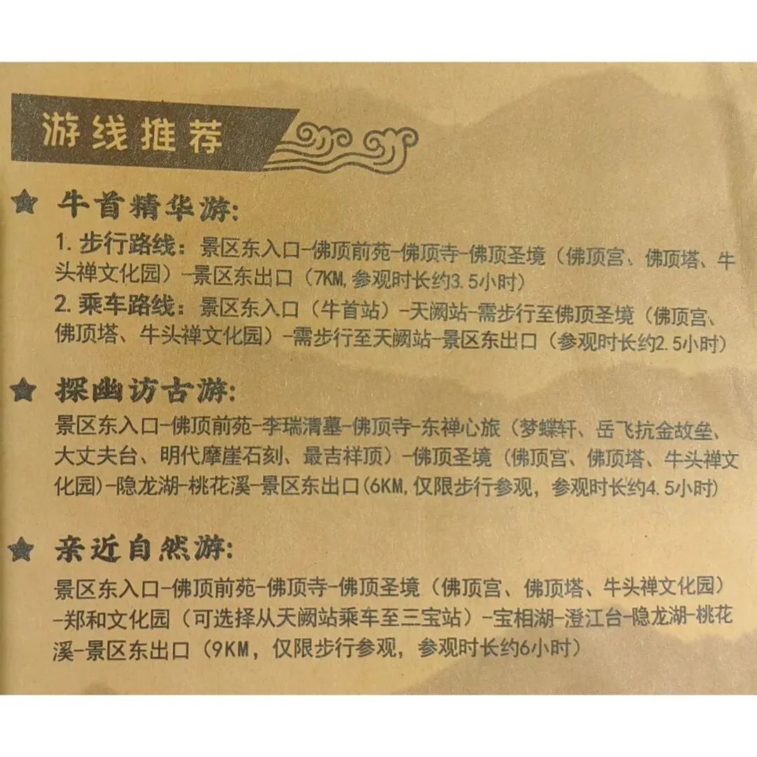 西门进-郑和墓-天阙站-佛顶塔-佛顶宫-牛头禅院-明代摩崖石刻-岳飞抗金故垒-佛顶寺-法融广场-佛顶前苑-东门出