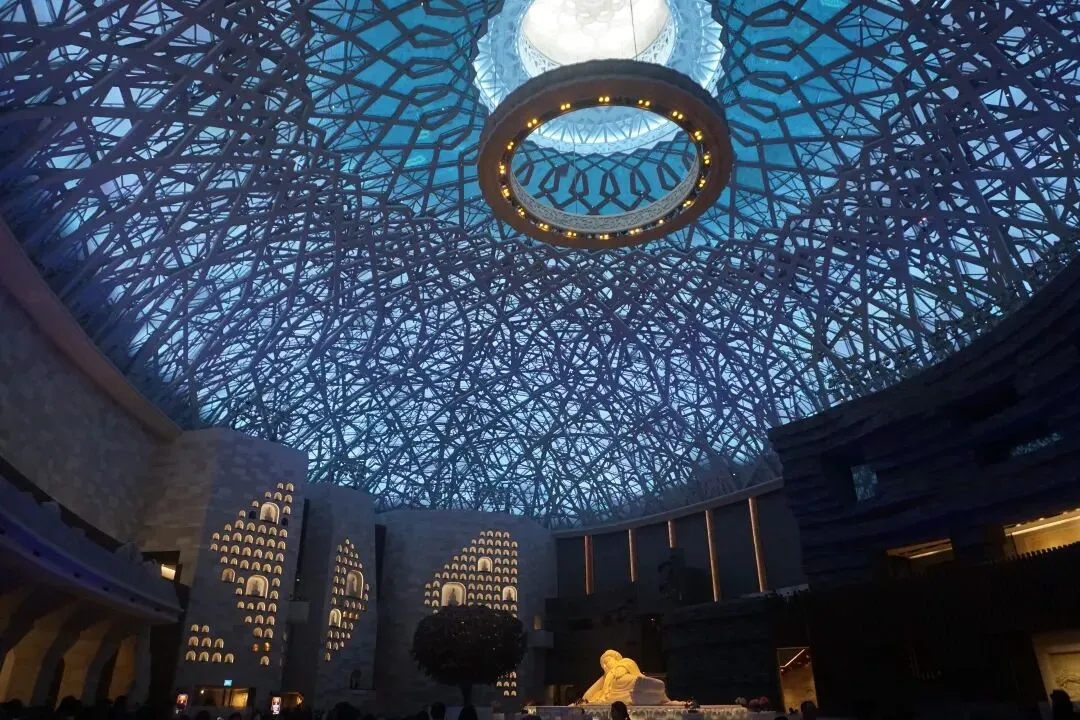 下成佛,空旷宏大的穹顶是仿桫椤树枝打造的。他是在