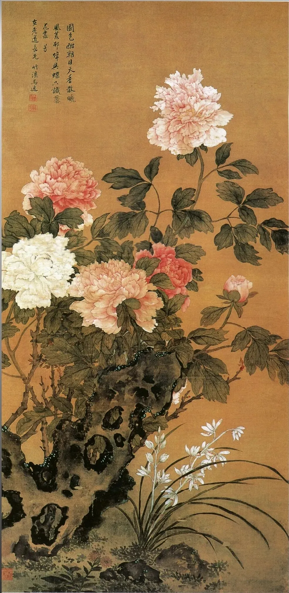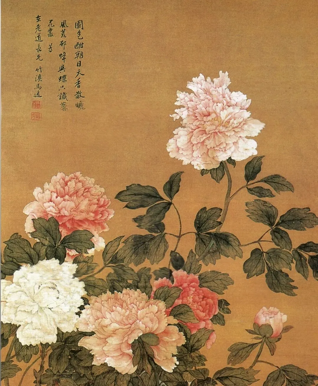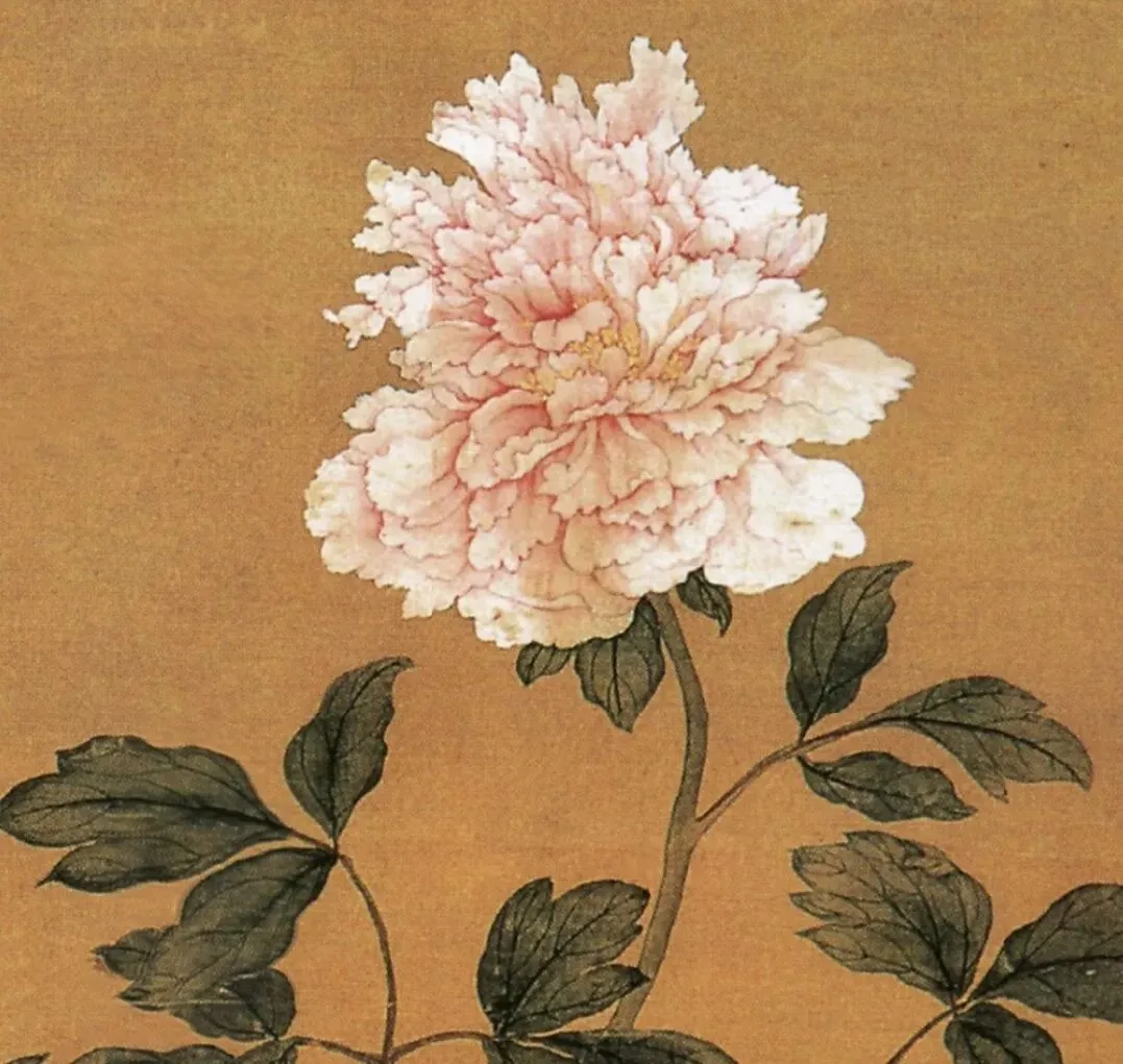 这幅《国色天香图》纵101.7厘米,横49.5厘米,绢本设色,现藏于南京博物院。画面以暖金色绢底为衬,主体是数株盛放的牡丹,高低错落,姿态万千:最上方一朵粉白牡丹亭亭玉立,花瓣层层叠叠,如凝脂般温润;左侧两朵一红一白,红者艳而不俗,白者洁而不素;下方两朵粉牡丹饱满丰盈,旁侧还缀着一枚含苞待放的花蕾,生机盎然。牡丹枝叶以浓淡墨色勾勒,阴阳向背分明,叶片的筋脉、枝干的纹理都刻画得细致入微,仿佛能触摸到叶片的肌理与晨露的湿润。