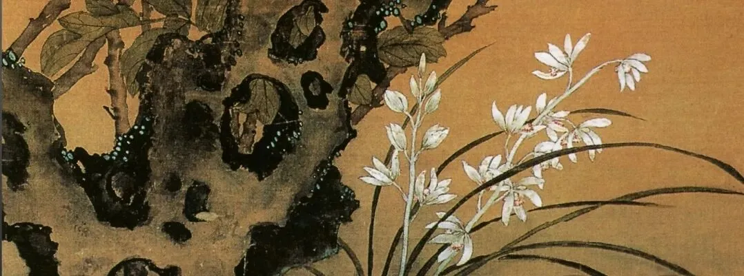 湖石与兰花的绘制,更是点睛之笔:太湖石以积墨法层层皴擦,表现出山石的孔洞与肌理,石青、石绿的点染让石头更显苍润;兰花以重粉罩染,胭脂点蕊,线条流畅飘逸,尽显君子之风,与牡丹的富贵形成“富贵不淫,清雅自持”的精神呼应,完美诠释了中国文人“达则兼济天下,穷则独善其身”的理想人格。