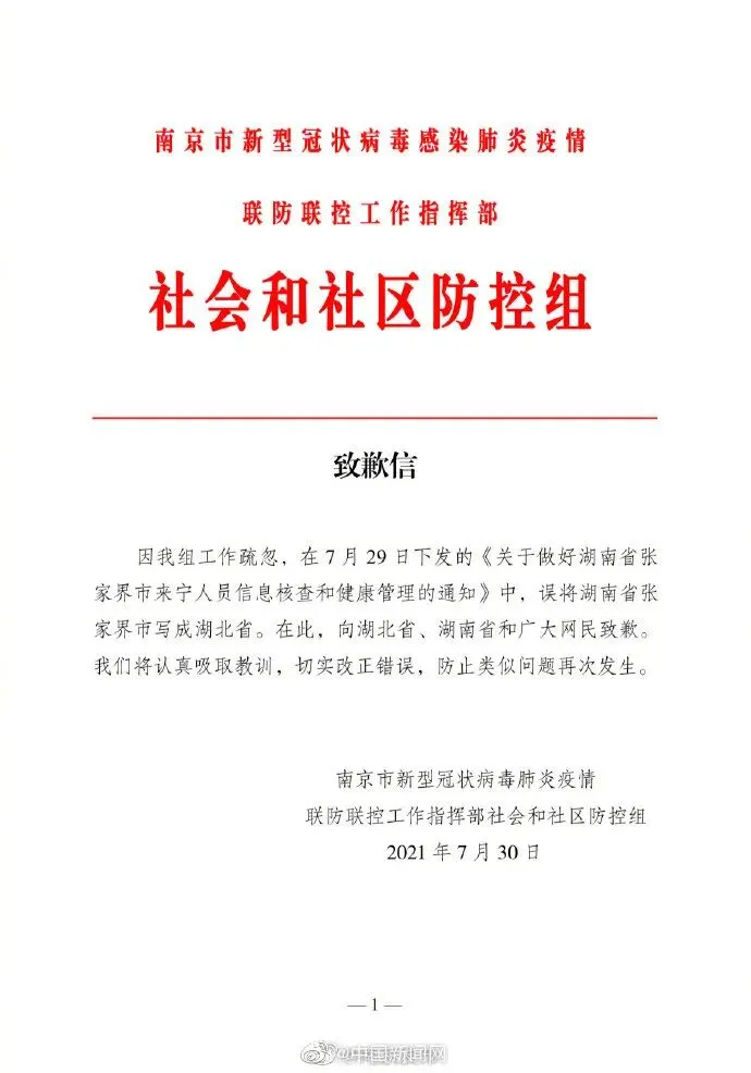 《致歉信》称,因工作疏忽,在7月29日下发的《关于做好湖南省张家界市来宁人员信息核查和健康管理的通知》中,误将湖南省张家界市写成湖北省张家界市。向湖北省、湖南省和广大网民致歉。据30日上午南京举行的新闻发布会通报,南京本轮疫情源头为7月10日的俄罗斯CA910入境航班。