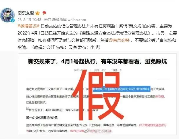 刚刚@南京交警微博辟谣:目前实施的记分管理办法并未有任何调整!所谓“新交规”的内容,主要为2022年4月1日起已经开始实施的《道路交通安全违法行为记分管理办法》。市民一定要擦亮眼睛,如有疑问可及时与交管部门联系,包括@南京交警,不要被这类谣言忽悠和欺骗。