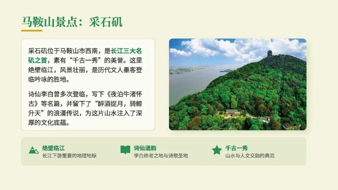 李白在这里写下《夜泊牛渚怀古》等名篇,还留下了“醉酒捉月,骑鲸升天”的浪漫传说。虽是传说,却和他狂放不羁的一生格外相衬。