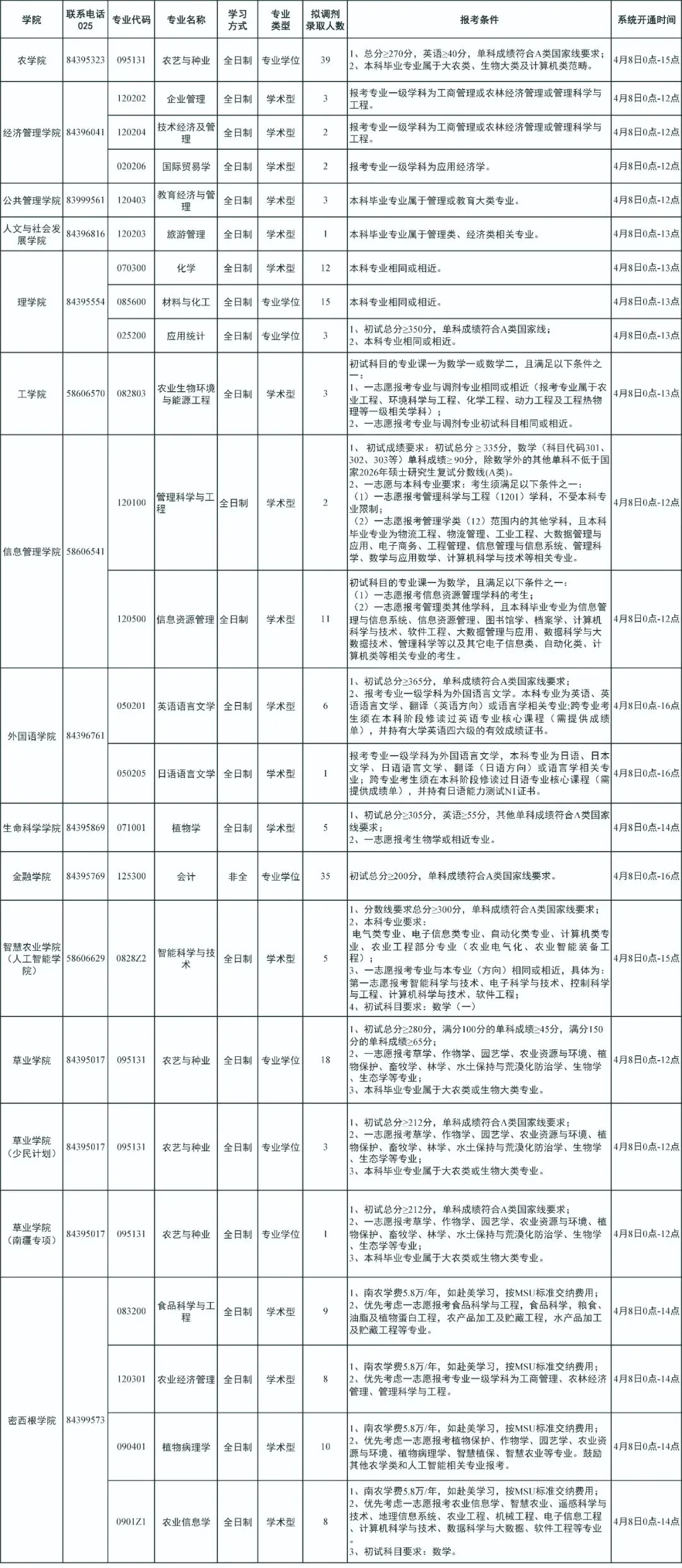 可能很多人不知道,很多专业还是有机会调剂去名校的,因为每一个名校都不是全能的,会有自己强势的学科,自然也有弱势的,就像厦门大学近几年都有招收五六百校外调剂的考生,而反观这些专业,就是厦门大学的薄弱科,一志愿生源严重不足,甚至个别专业因为不太被人知道,连调剂生源都不足,最终没招满就结束了。当然大家也要认识到一点:考研调剂毕竟是挑剩下的,非常热门的专业或者专业具备一定排名的学校有调剂的可能都不大,因此如果调剂能是名校已经是非常幸运了,这个时候还挑三拣四可能真说不过去。上面说的调剂生源都不太充足的现象是有的,但名校一定不多甚至没有,更大的可能是会面临比一志愿更激烈的竞争,一般来说一志愿复试比都在1.2:1-1.5:1之间,个别会到2:1,但名校调剂基本上不会低于2:1,大部分都是3:1,有些甚至会更高,因此一定要提前获取调剂信息,并且好好准备复试!考211为大家按学校收集整理接受调剂的专业,后续如果有时间再为大家整理以学科汇总,今天为大家整理的是南京农业大学2026年硕士研究生调剂专业及人数:很多人可能觉得调剂不就是别人发布调剂信息,然后看自己符不符合,然后进行申请,如果合适进入调剂复试,再进行角逐,成功者上岸,失败者继续么?