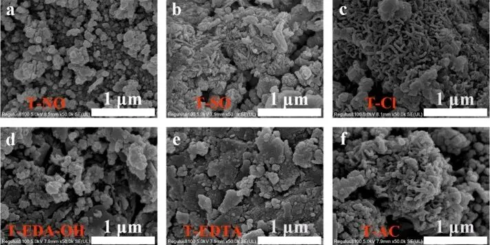 Fig. 1. SEM images of different s-Fe0@Cu-Pd catalysts: (a) T-NO, (b) T-SO, (c) T-Cl, (d) T-EDA-OH, (e) T-EDTA, and (f) T-AC.