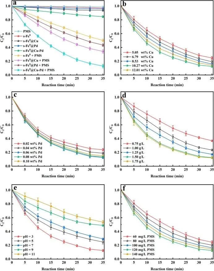 Fig. 2. The catalytic degradation rates of single, double and trimetals to NOR under PMS system (a), respectively (10.27 wt% Cu, 0.06 wt% Pd, 1.50 g/L dosage of catalyst, pH = 3 and 120 mg/L PMS). The influence of Cu loading amount (b), Pd loading amount (c), T-Cl adding amount (d), initial pH value (e) and PMS adding amount (f) on the degradation of NOR by the T-Cl/PMS system.