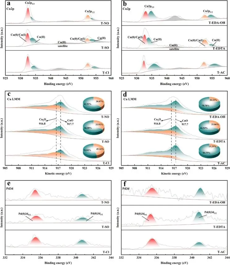 Fig. 4. XPS spectra of Cu2p (a and b), Auger spectra of Cu (c and d) and XPS spectra of Pd3d (e and f) for all the synthesized s-Fe0@Cu-Pd particles.