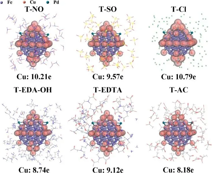 Fig. 5. Electron density profiles of Cu 3d in various s-Fe0@Cu-Pd catalysts. Fe, Cu and Pd atoms are depicted by small blue, orange and green balls, respectively.