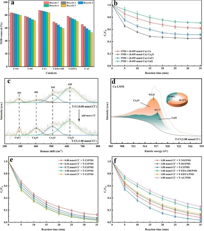 Fig. 6. Cyclic stability of the s-Fe0@Cu-Pd samples (a), degradation performances of NOR by activated PMS with different Cu compounds (b), the Raman (c) and XPS (d) spectra of T-Cl catalysts. The catalytic performance of T-Cl catalysts synthesized at different Cl− ion addition (e) and various s-Fe0@Cu-Pd catalysts synthesized at the optimal chloride addition (1.08 mmol) (f) in combination with PMS for the degradation of NOR.利用不同的铜源构建了六种 s-Fe0@Cu-Pd/PMS 复合材料体系,并用于降解 NOR。扫描电镜图像显示,与 T-NO、T-SO、T-EDA-OH、T-EDTA 和 T-AC 相比,T-Cl 表现出均匀的棒状结构,长度和厚度一致,形成了疏松的多孔网络。此外,氮吸附和解吸等温线表明,T-Cl 具有最高的比表面积和孔隙率。XPS、拉曼光谱和 DFT 分析证实,在富氯条件下合成的三金属催化剂中生成了 CuCl。Cl- 的引入促进了 CuCl 的优先形成,CuCl 随后水解生成额外的 Cu2O。Cu(I) 比例的增加增强了 PMS 的活化,从而提高了 T-Cl/PMS 体系中 NOR 的降解效率。在最佳条件下,T-Cl/PMS 系统对 NOR 和 TOC 的最大去除率分别为 96.25 % 和 55.87 %。此外,反应后溶液的生物毒性也显著降低。EPR 表征和淬火实验表明,在 T-Cl/PMS 系统中,SO4-是降解 NOR 的主要 ROS。据推测,Cu 位点促进了 PMS 和 O2 的活化,从而产生了多种活性物种,包括 SO4--、-OH、O2--和 1O2。TEM 和 HAADF-STEM 显微照片以及元素线扫描剖面图阐明了钯在铜位点上的原位生长。因此,钯位点产生的 H- 促进了 Cu0/Cu(I) 的再生,从而维持了 T-Cl/PMS 系统的高催化活性和可回收性。最后,根据 LC-MS 鉴定出的中间产物,提出了 NOR 的三种潜在降解途径。s-Fe0@Cu-Pd/PMS复合系统在高级去除难降解污染物方面具有巨大潜力。Chaoyi Zhou, Weilong Xing, Zhen Wang, Wen Gu, Linjun Zhou, Mengyuan Liang, Shuai Sun, Bing Zhang, Lei Wang, Efficient activation of PMS for norfloxacin detoxification and mineralisation via chlorine-modified iron-based trimetallics: Profound modulation of copper valence states, Separation and Purification Technology, 2025, https://doi.org/10.1016/j.seppur.2024.131187声明:本公众号仅分享前沿学术成果,无商业用途。如涉及侵权,请立刻联系公众号后台或发送邮件,我们将及时修改或删除!
