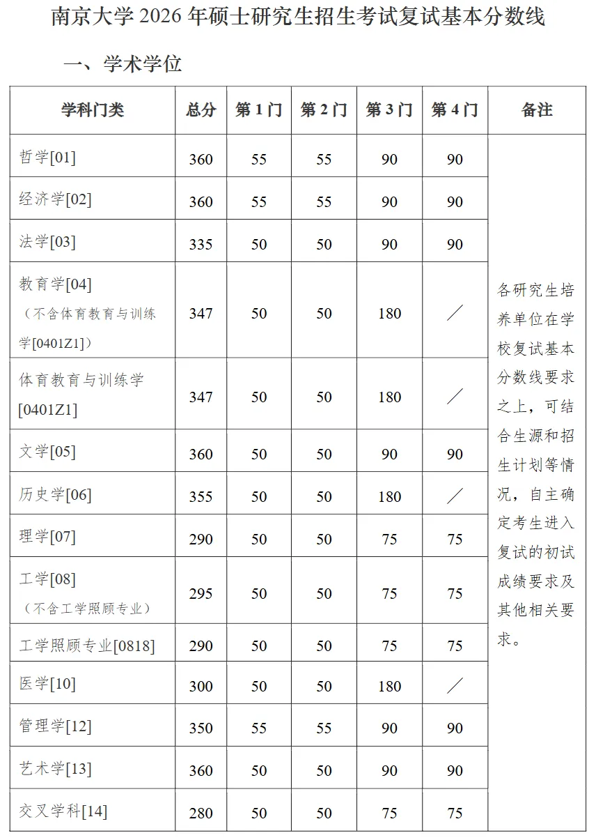 南开大学2026年硕士研究生复试基本分数线