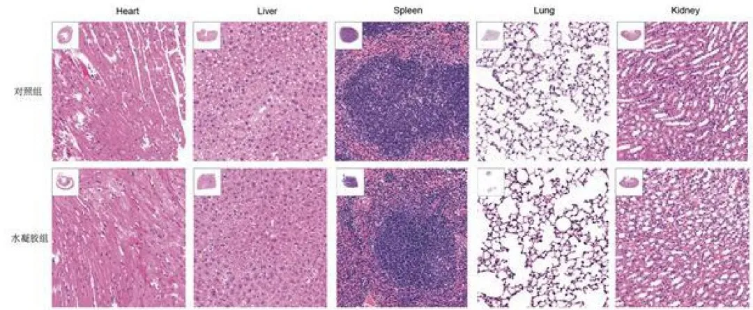 将水凝胶注射入小鼠腹腔,4周后取心、肝、脾、肺、肾进行病理分析,未见任何器官损害。证明材料无毒、无免疫原性。