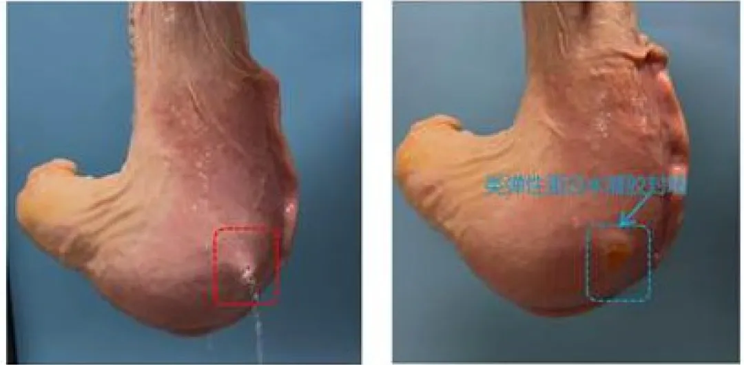 离体猪胃:直径5 mm穿孔,水凝胶1秒封堵,无液体泄漏