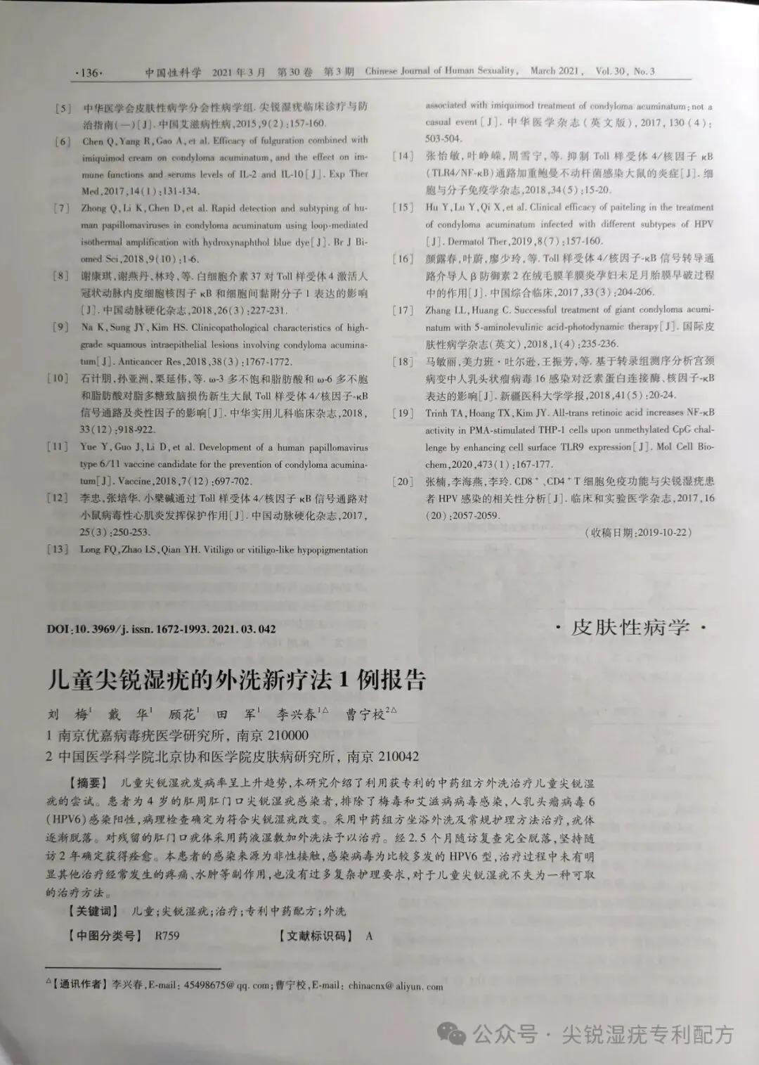 该专利组方应用于临床治疗20多年,不仅帮助了数以万计的复发患者解决困扰,还被医学书籍《尖锐湿疣的诊治》收录在册,并两次在核心医学期刊《中国性病科》上发表多篇学术论文。在2019年11月第28卷第11期《中国性科学》杂志中发表了一篇名为《使用专利中药处方治疗一例巨大型肛周尖锐湿疣》的学术性论文;在2021年3月第30卷第3期《中国性科学》杂志中发表了一篇名为《儿童尖锐湿疣的外洗新疗法1例报告》的学术性论文。详情如下图所示: