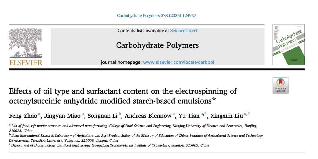 2026年1月14日,南京财经大学食品科学与工程学院刘兴训(通讯作者),田雨(通讯作者)团队,在国际TOP期刊 Carbohydrate Polymers(Q1,IF: 12.5)发表题为 “Effects of oil type and surfactant content on the electrospinning of octenylsuccinic anhydride modified starch-based emulsions”的研究性论文。