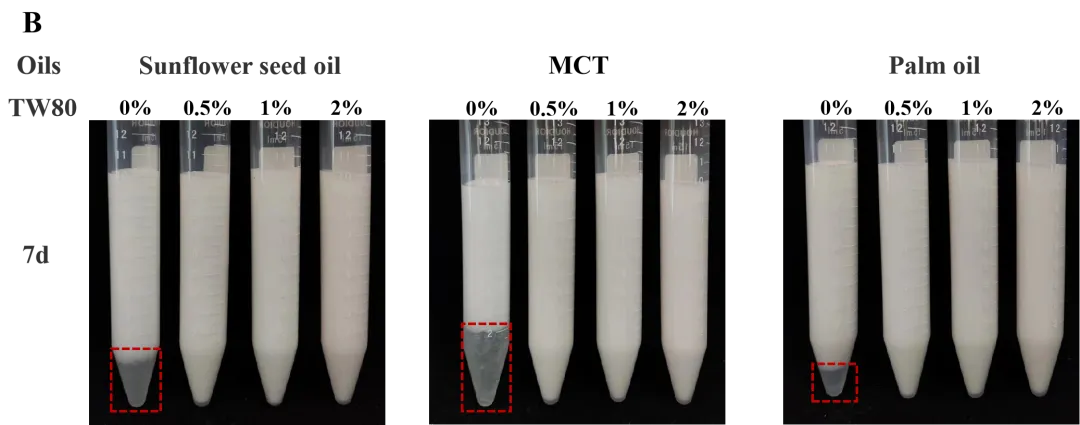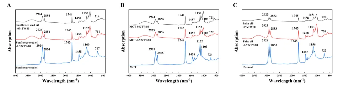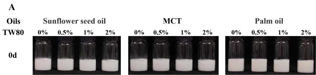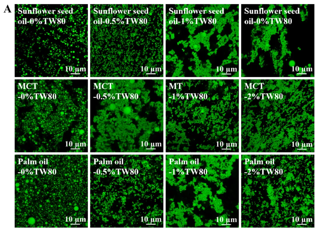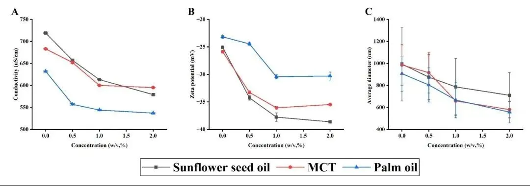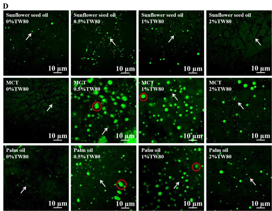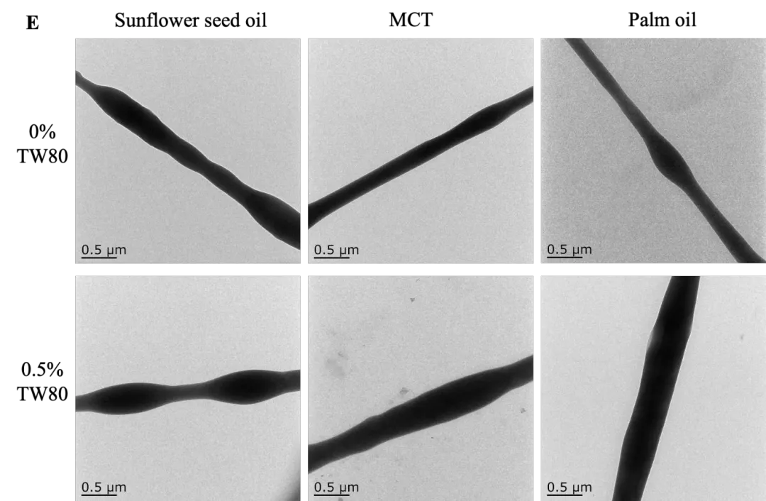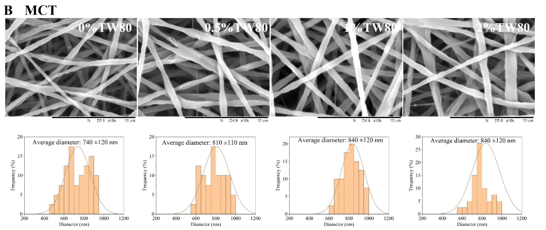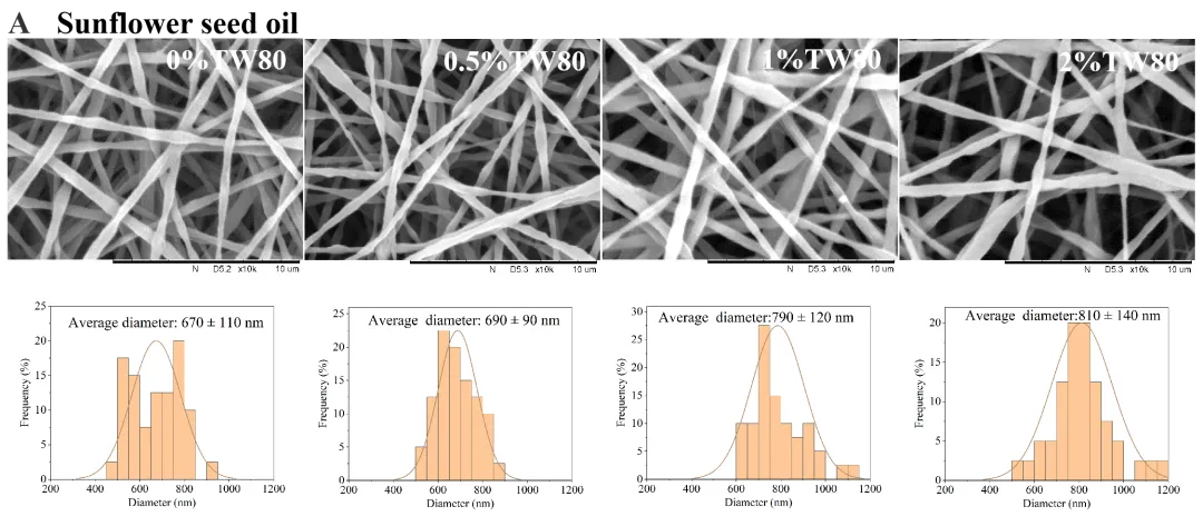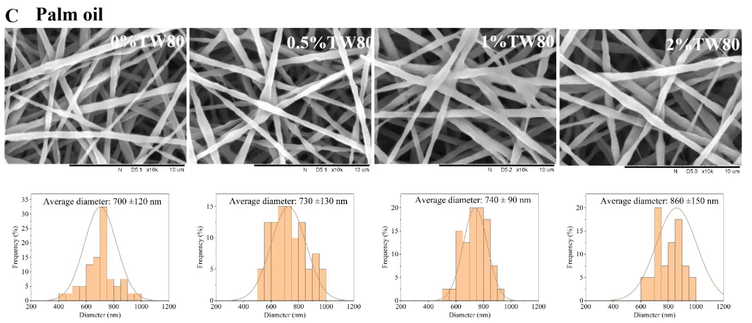本研究以OSA改性淀粉-普鲁兰多糖复合体系为基础,选取了三种具有不同脂肪酸组成的食用油(向日葵油、中链甘油三酯MCT和棕榈油),结合不同浓度的Tween 80,系统制备了OSA淀粉基乳液并进行静电纺丝。研究从乳液稳定性、表观黏度、界面张力、电导率、Zeta电位和液滴粒径等多个维度对乳液性质进行了全面表征,并通过SEM、CLSM、TEM和FTIR等手段对纳米纤维的形貌、内部结构及化学组成进行深入分析,同时定量评价了不同体系纤维的载油量,系统揭示了油脂类型与表面活性剂浓度对乳液行为和纤维成形的协同调控机制。