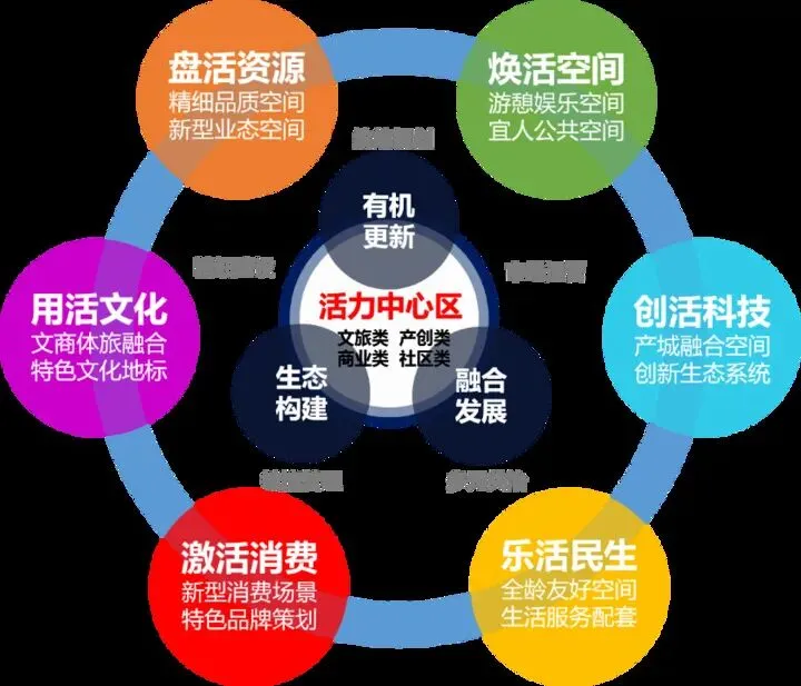 活力中心区建设具有“3456”发展模式特征——坚持有机更新、生态构建、融合发展3大发展原则,发展文旅、产创、商业、社区4种主导类型,以系统化思维探索构建统筹规划、精细建设、市场运营、敏捷管理、多元共治5大建设生态体系,实现盘活资源、焕活空间、用活文化、创活科技、激活消费、乐活民生6个活力目标。
