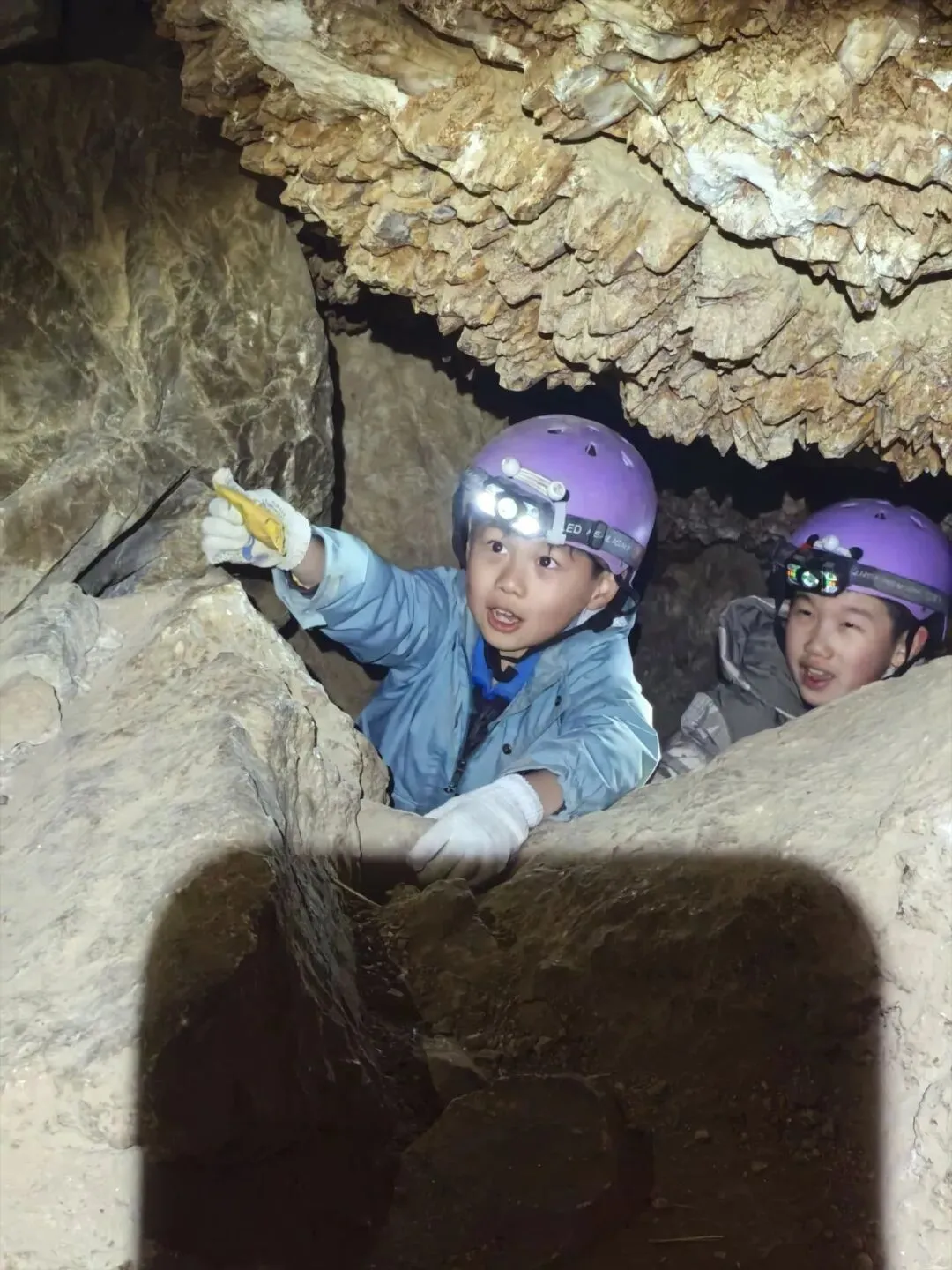 孩子们分组行动,分工明确:有人负责照明引路,有人记录地貌特征,有人用镜头捕捉美景,还有人发挥创意为景观命名——排列整齐的钟乳石被称作“卫士长廊”,钟乳石与石笋相连的天然拱门得名“地心之门”,高低错落的石笋群则成了“石笋森林”。在教练指导下,孩子们还将用专业工具小心翼翼采集岩石碎片、土壤样本,既能后续深入研究洞穴形成演化,也能留存这场探险的珍贵纪念。