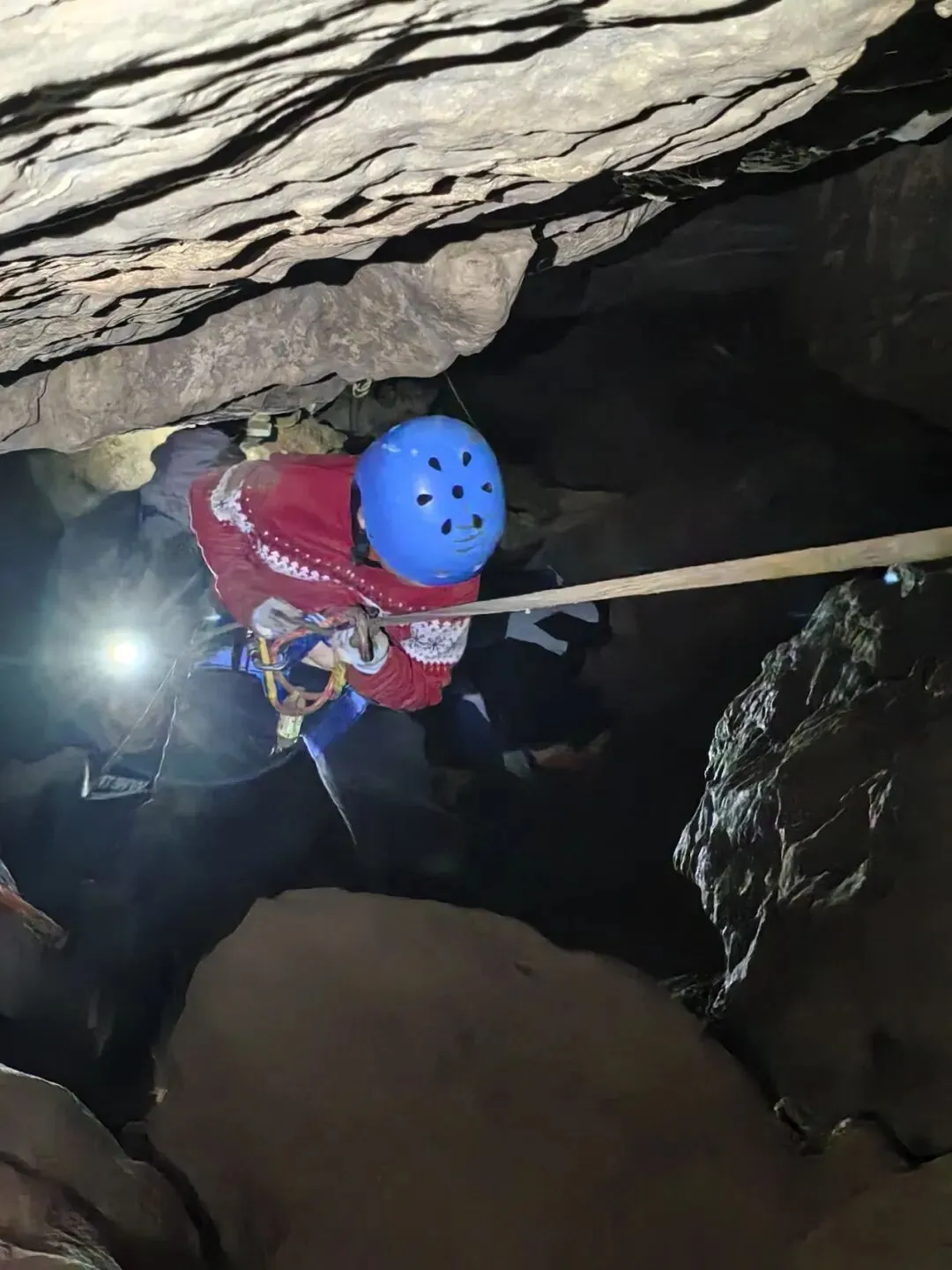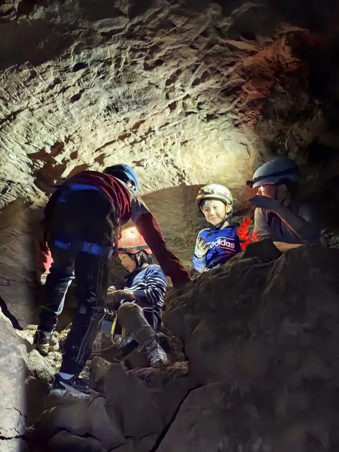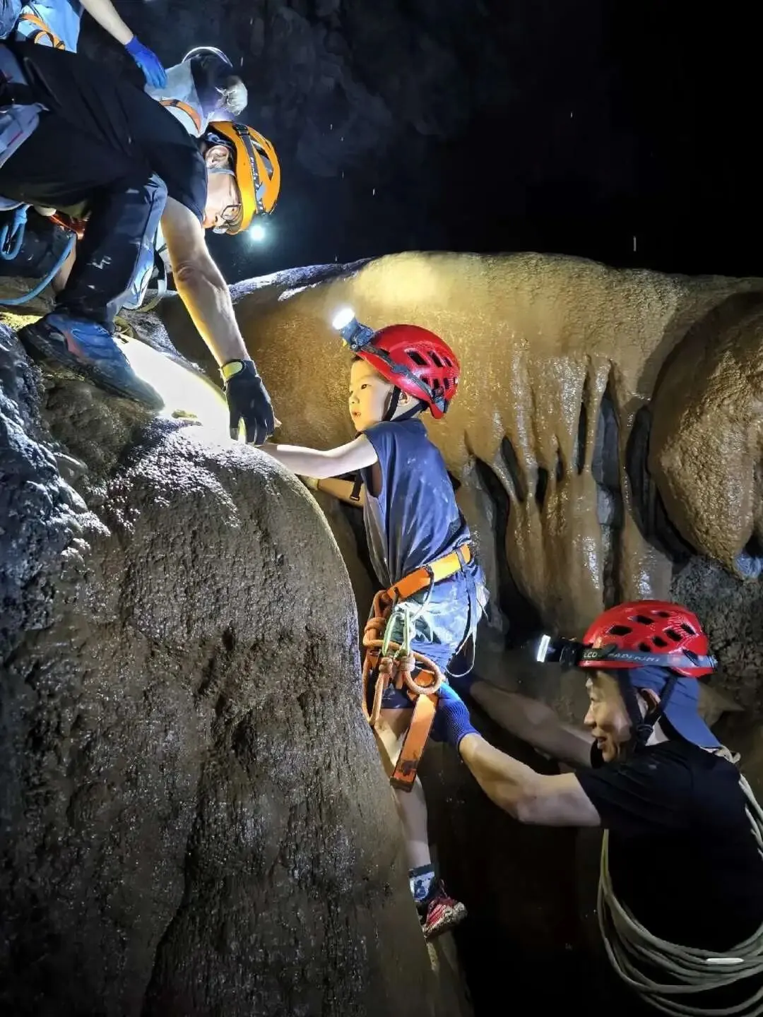 洞内岩石犬牙交错,时而如巨人手掌般陡峭直立,时而如蜿蜒巨龙般曲折盘旋。孩子们在教练的全程指导下,紧握上升器稳步攀爬,每一次发力都充满对未知的向往;面对下降路段,他们克服内心忐忑,精准控制速度,沿着绳索缓缓而下。此时团队协作尤为关键,后方伙伴密切关注前方动态,下方队员做好接应准备,全程安全有序,在挑战中锤炼勇气与专注力。