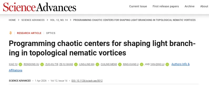 液晶(LC)具有自组装结构与对外场高度敏感的特性,是实现可重构无序光学系统的理想平台。南京大学陆延青教授、李炳祥教授、Ling-Ling Ma等以及电子科技大学蒙翠玲教授等携手在向列相液晶(NLC)体系中,实现了光与局域化空间混沌中心的直接相互作用,产生了通道可操控、对称性保护的光分支流。